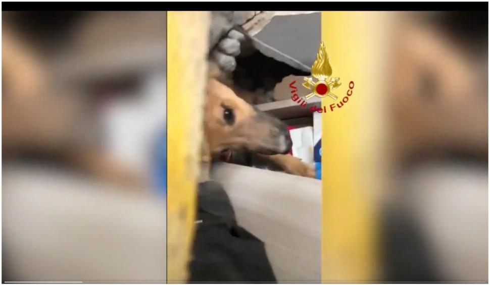 Pompierii au difuzat un videoclip în care se poate vedea câinele aflat sub dărâmături, protejat de bucăţi de lemn şi zidărie, salvatorii anunţând ulterior că animalul este bine.