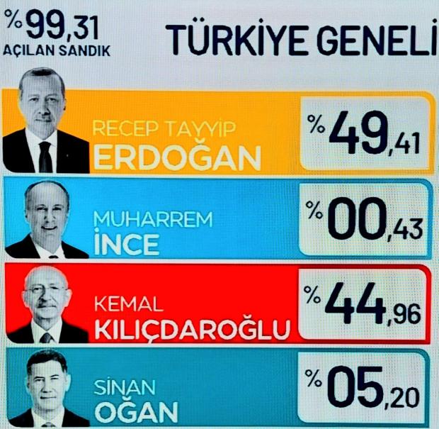 După numărarea a peste 99,3% din buletine, în fruntea clasamentului rămâne președintele în funcție, Recep Tayyip Erdogan, cu 49,4%.