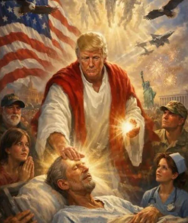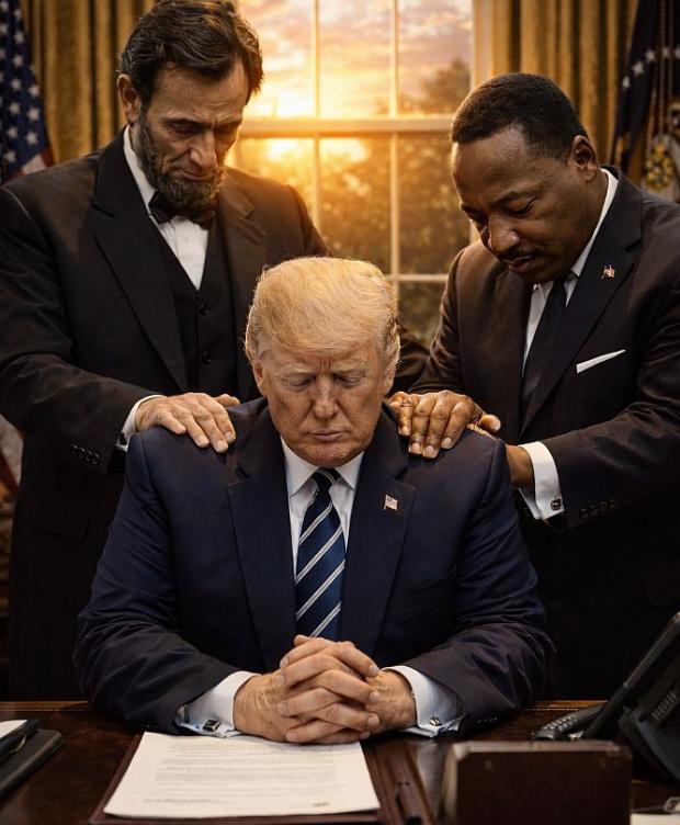 El a distribuit inclusiv un conținut vizual generat cu AI în care președintele pare să se roage în Biroul Oval, cu spiritele lui Martin Luther King Jr. și Abraham Lincoln în spatele său.