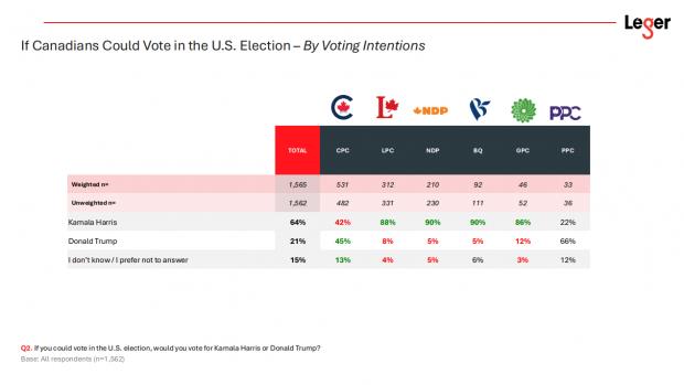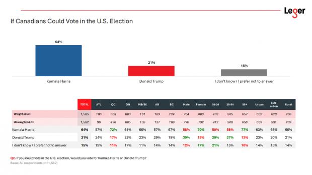 Un sondaj Leger din octombrie 2024 arăta că 64% dintre canadieni ar vota-o pe Harris dacă ar fi fost votanți americani. Doar 21% ar fi mers pe mâna lui Trump.