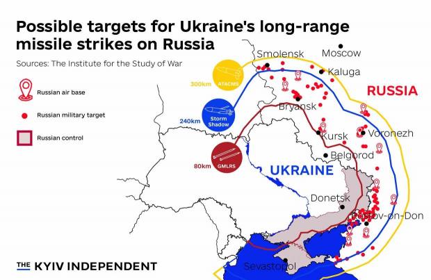 Dacă sunt plasate aproape de liniile frontului din Ucraina, armele cu rază lungă de acțiune furnizate de Occident ar putea pune în zona de tragere vaste zone de teritoriul rusesc. Zona include baze militare, aerodromuri, concentrări de trupe și depozite de muniții.