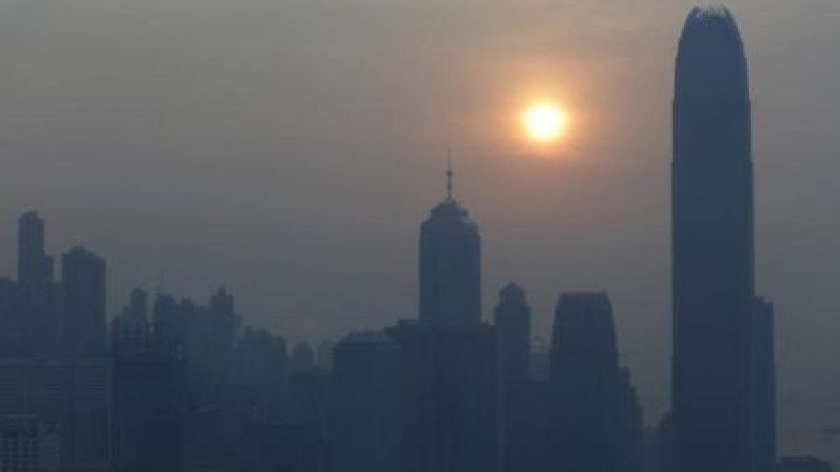 Celebrii zgârie-nori din Hong Kong erau acoperiţi de un nor albicios, iar cerul avea o nuanţă de gri, în pofida unui soare puternic.