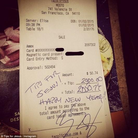 "Am crezut că mi se face o glumă când am văzut ce scria pe bon: 2.000 de dolari, bacşiş. Apoi am citit ce scria cu pixul: "Tips for Jesus" (bacşiş pentru Iisus), apoi mi-a urat un an nou fericit", spune chelnerul.