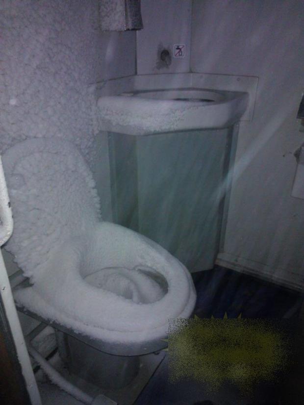 Gerul cumplit, ninsorile abundente, dar şi lipsa de încălzire au făcut ca acest tren să se asemene cu un munte de zăpadă şi gheaţă. Călătorii au fost pur şi simplu îngroziţi atunci când au mers la toaletă.