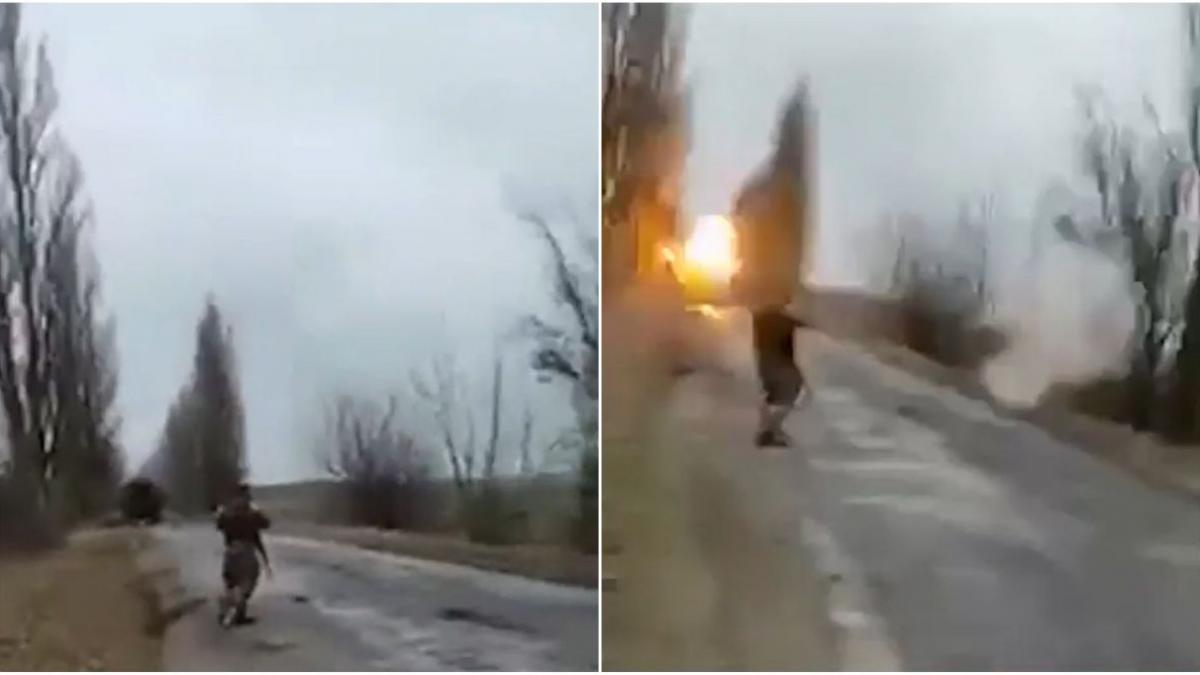 Doi civili înarmați cu un lansator de rachete au fost filmați în timp ce au tras într-un tanc al rușilor.