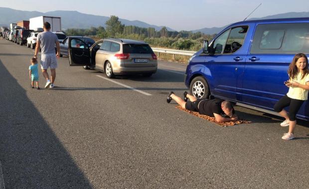 Oamenii așteaptă de ore bune să treacă vama. Un bărbat s-a întins pe jos la punctul de frontieră Kulata, dintre Bulgaria şi Republica Elenă.