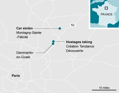 Un martor ocular, care lucrează în zona industrială din Dammartin-en-Goële a auzit focuri de armă: "Lucrez la depozitul Kuehne Nagel din zona industrială. În urmă cu aproximativ o jumătate de oră am auzit focuri de armă şi în cinci minute era prezentă toată securitate, elicopoterele poliţiei. Ni s-a interzis să ne apropiem de ferestre şi trebuie să rămânem în interiorul depozitului. Nu mai este nicio mişcare nici nu se intră, nici nu se iese".