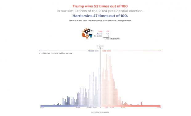 Dacă săptămâna trecută Harris câştiga în 54 din 100 de simulări, situaţia pare că s-a inversat de astăzi şi Trump se aşează pentru prima oară în fotoliul de favorit, câştigând victoria în 53 din 100 de simulări, în timp ce contracandidata sa câştigă în 47 din 100. În patru dintre cele 1.000 de simulări, niciunul dintre cei doi nu reuşeşte să treacă de 270 de voturi în Colegiul Electoral.