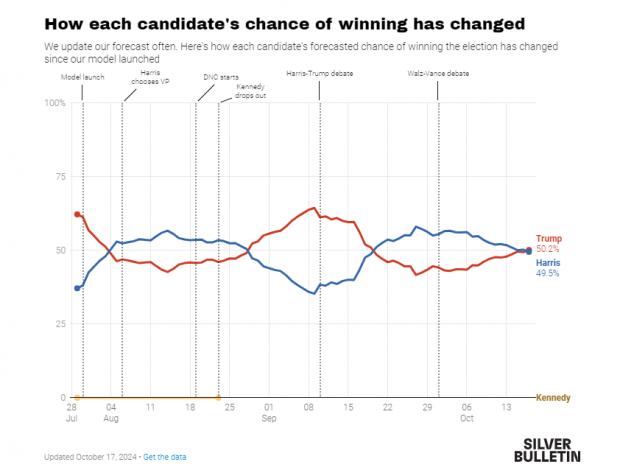 Modelul lui Silver a fost ceva mai generos cu Trump încă de la început, arătând de mai multe ori de-a lungul cursei un Trump favorit să câştige, cel mai recent pe 19 septembrie, când fostul preşedinte era creditat cu o şansă de 51 de procente.