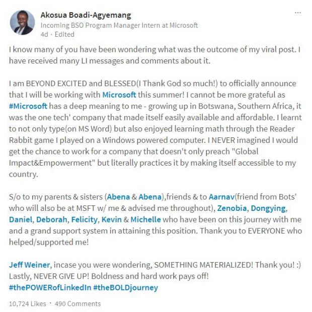 O studentă din Miami a reușit să obțină un internship la Microsoft într-un mod mai puțin obișnuit. Aceasta a postat un mesaj pe LinkeIn în care a scris că este în căutarea unui internship în domeniul financiar pe perioada verii. În postarea sa, Akosua Boadi-Agyemang l-a etichetat pe CEO-ul LinkedIn, Jeff Winer, rețeaua socială fiind deținută de Microsoft.
