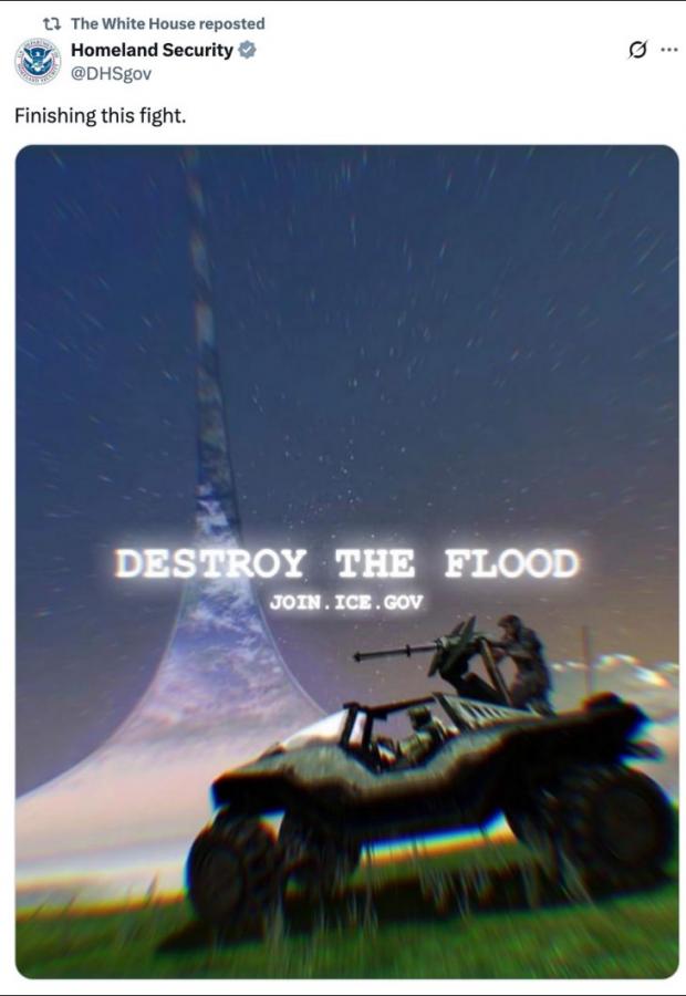 Câteva zile mai târziu, Departamentul pentru Securitate Internă a publicat propria sa versiune a meme-ului, folosind imagini din Halo pentru a promova recrutările în rândul agenților ICE. Sub titlul „Stop the Flood”, mesajul compara invazia extratereștrilor din joc cu… fluxul de imigranți din Statele Unite.