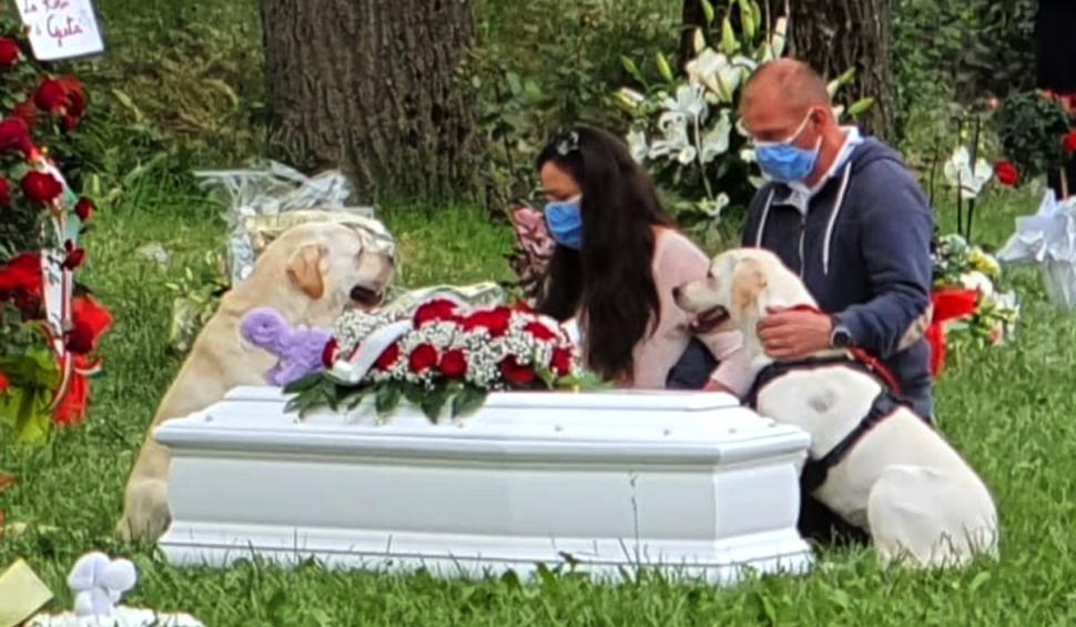 Cei doi câini Labrador ai familiei au stat, la rândul lor, lângă sicriu, iar martorii tragediei au explicat că atunci când fetița româncă s-a înecat, cei doi câini au încercat să o salveze.