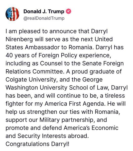 ”Am plăcerea de a anunța că Darryl Nirenberg va fi următorul ambasador al Statelor Unite în România. Darryl are 40 de ani de experiență în politica externă, inclusiv în calitate de consilier al Comisiei pentru relații externe a Senatului. Un mândru absolvent al Universității Colgate și al Facultății de Drept a Universității George Washington, Darryl a fost, și va continua să fie, un luptător neobosit pentru agenda mea America First. El ne va ajuta să consolidăm legăturile noastre cu România, să susținem parteneriatul nostru militar și să promovăm și să apărăm interesele economice și de securitate ale Americii în străinătate. Felicitări Darryl!”, a transmis Trump.