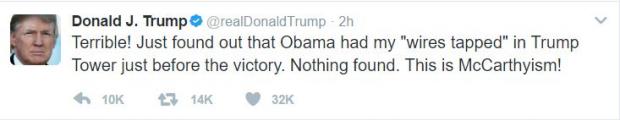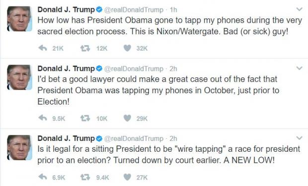 "Execrabil! Am descoperit că preşedintele Obama mi-a pus sub ascultare liniile telefonice în Trump Tower încă înainte de victoria mea", a notat Trump.