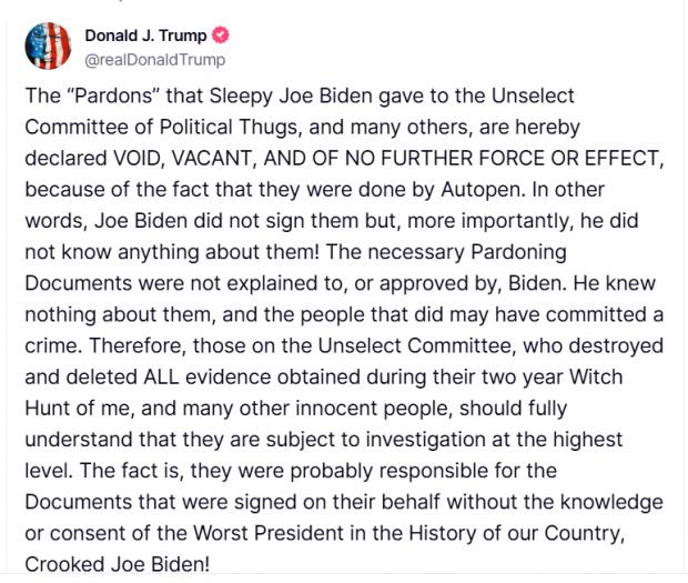 "Grațierile pe care 'somnorosul' Joe Biden le-a acordat Comisiei Nealese de Criminali Politici și multor altora sunt declarate prin prezenta NULE, NEAVENITE și FĂRĂ EFECT, din cauza faptului că au fost făcute cu autopen-ul. Cu alte cuvinte, Joe Biden nu le-a semnat, dar, mai important, nu știa nimic despre ele!", susține Trump în postarea sa.