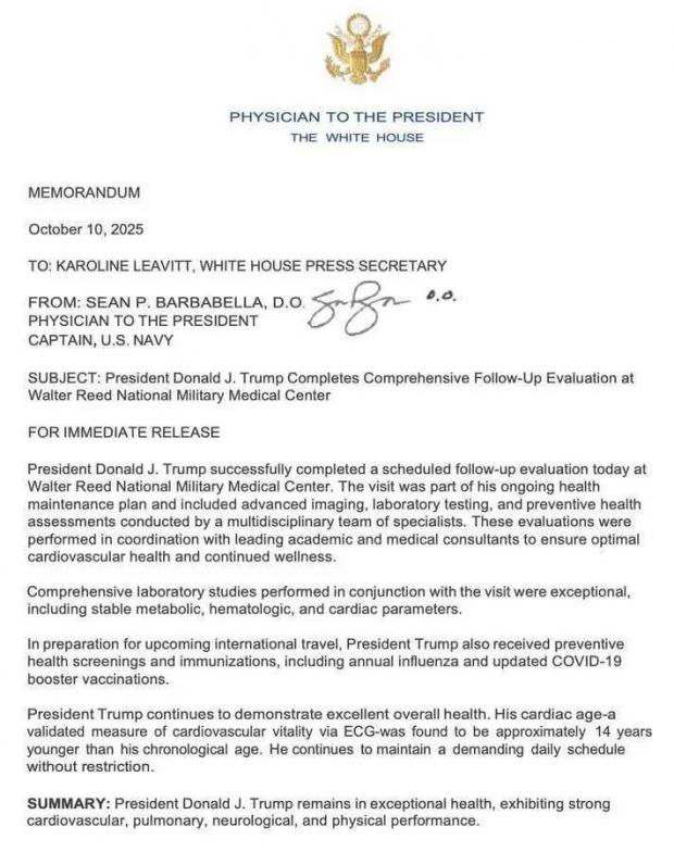 „Președintele Trump continuă să demonstreze o stare generală de sănătate excelentă. Vârsta sa cardiacă, o măsură validată a vitalității cardiovasculare prin ECG, a fost estimată la aproximativ 14 ani mai tânără decât vârsta sa reală. El își menține în continuare un program zilnic solicitant fără restricții”, a adăugat Barbabella.