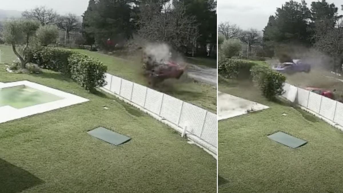 Două autoturisme Ferrari, unul roșu și celălalt albastru, au părăsit carosabilul unul după altul, ieșind dintr-o curbă și izbind cu putere zidul unei vile aflate în apropierea străzii pe care circulau.