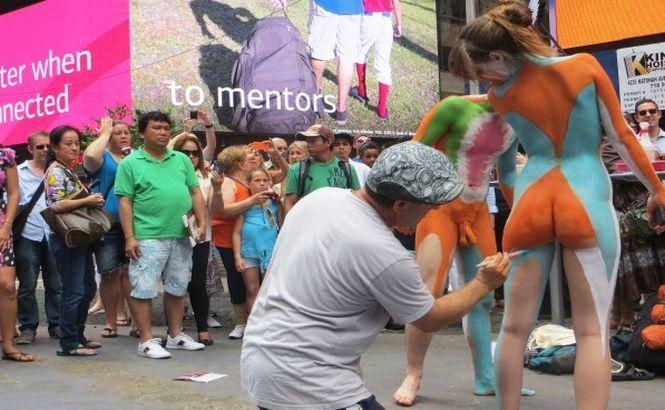Cu toate că nuditatea este ilegală în New York, o nouă lege, intrată recent în vigoare, permite astfel de gesturi doar dacă acestea fac parte dintr-o expoziţie de artă. Aşa că pictorul şi-a luat aprobările necesare şi şi-a mutat creaţiile goale-puşcă în stradă.