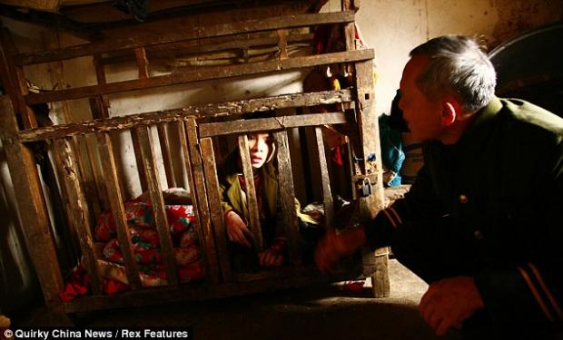 Wei Yun, în vârstă de 23 de ani nu ştie să vorbească sau să meargă. Atunci când părinţii îl mai scot din cuşcă, acesta se târăşte pe coate şi genunchi asemeni unui bebeluş.