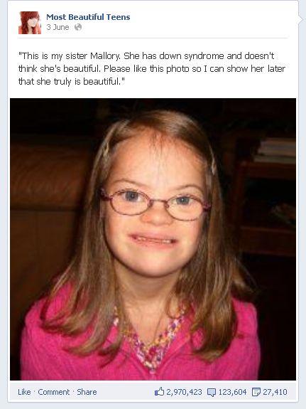 "Aceasta este sora mea, Mallory. Are sindromul Down şi crede că nu este frumoasă. Vă rog să daţi Like la această fotografie pentru a-i arăta că este cu adevărat frumoasă".