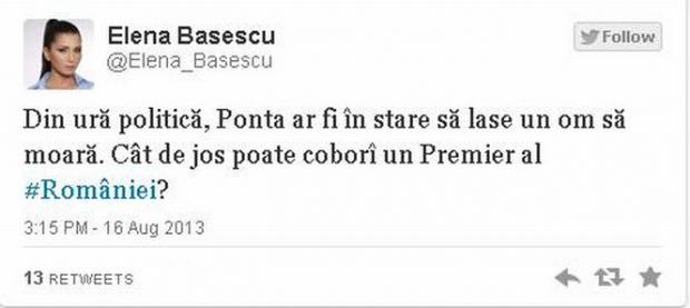 "Din ură politică, Ponta ar fi în stare să lase un om să moară. Cât de jos poate coborî un premier al României?", scrie Elena Băsescu pe Twitter.