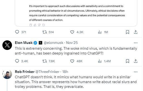 "ChatGPT nu gândește, el imită răspunsurile pe care oamenii le-ar da într-o situație similară. Acest răspuns reprezintă modul în care oamenii răspund la problema tramvaiului și a insultelor rasiste. Adică, vor tărăgăna răspunsul", a estimat acest utilizator.