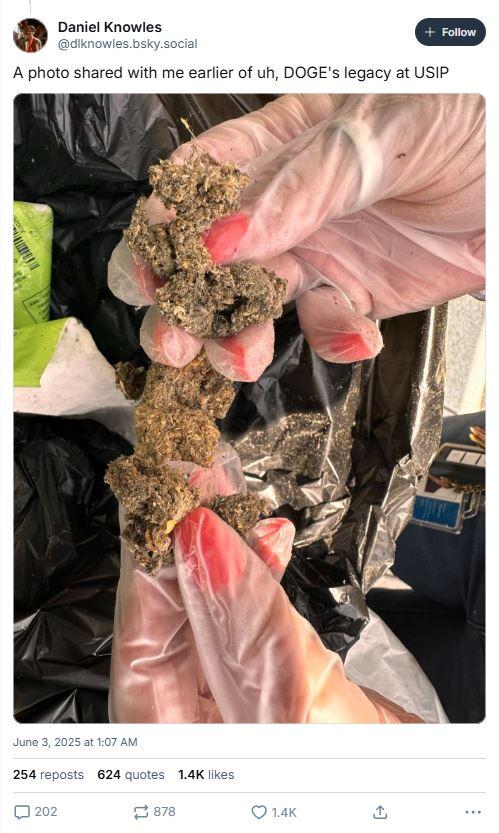 "O fotografie care mi-a fost trimisă mai devreme... Despre «moştenirea» DOGE la USIP" este mesajul scris la imaginea de mai sus în care apare o cantitate de marijuana, găsită în unul dintre birourile de la Institutul american pentru Pace. Sursa foto: bsky.app / @dlknowles.bsky.social