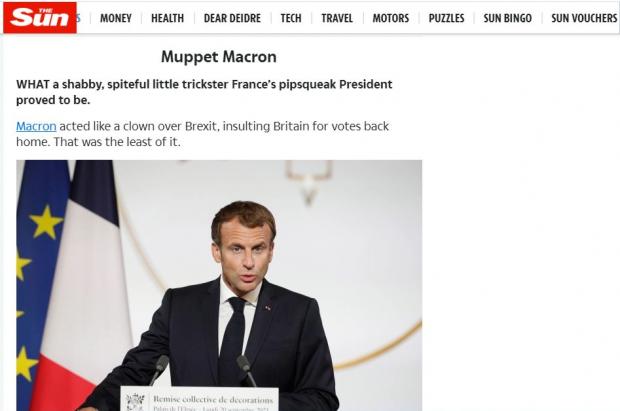 Un recent articol nesemnat, publicat în tabloidul The Sun sub titlul Muppet Macron (literal, 'Macron, fraierul' ), afirmă că președintele francez s-a dovedit a fi un "păcălici răutăcios neimportant" (în original, 'a spiteful little trickster, France’s pipsqueak President'), ca urmare a poziției sale în privința Brexit.