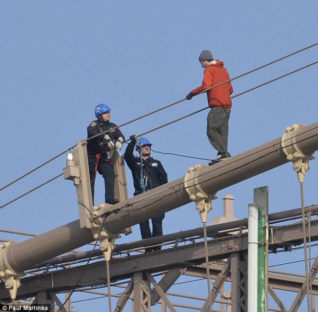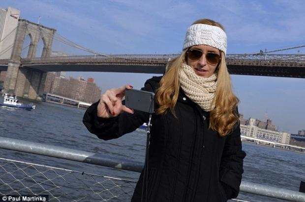 Femeia, turistă în New York City, şi-a făcut singură o fotografie, conştientă fiind că în spatele ei, pe Brookly Bridge se desfăşurau momente dramatice: poliţiştii încercau să convingă un sinucigaş să nu se arunce de pe pod.