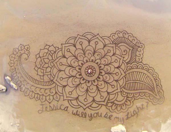 Pentru a desena se foloseşte de o greblă, iar creaţiile sale se pot întinde pe suprafeţe ameţitoare.
