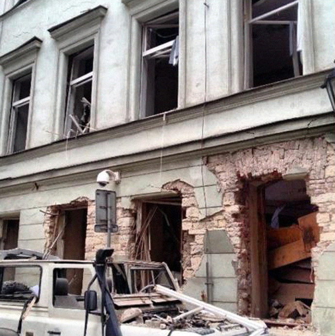 Surse ale autorităţilor locale au declarat că deocamdată nu s-a stabilit cauza deflagraţiei de pe strada Divadelni, dar se bănuieşte că ar fi vorba de o scurgere de gaze dintr-o clădire veche, care aparţine Teatrului Naţional.Toată zona este acoperită de moloz şi praf şi a fost izolată.