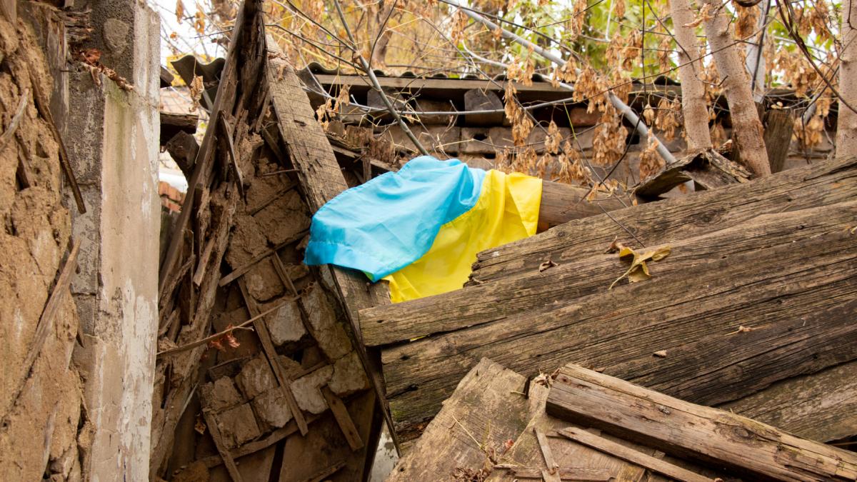 Steagul Ucrainei printre dărâmături. Imagine cu caracter ilustrativ. Sursa foto: Getty Images