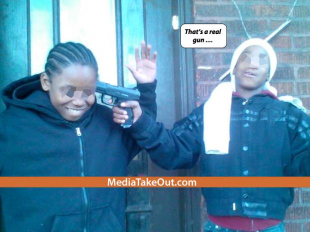 Se afla alături de un "prieten" pe care îl ameninţa cu un PISTOL real. Celălalt copil, ridică mâinile în semn de predare. Cu toate că totul nu este decât o glumă, a lipsit foarte puţin pentru ca totul să se transforme într-o tragedie.