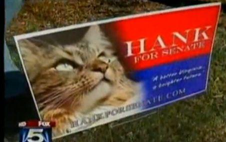 Cel mai nou candidat la funcţia de senator al statului Virginia este Hank. Motanul Hank. Un candidat..... moderat, asigură stăpânul, care a avut grijă ca felina să aibă parte de tot ce-i trebuie unui aspirant la fotoliul de senator.