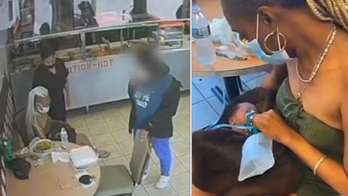 Imaginile o surprind pe tânăra care a intrat agitată în restaurant. La un moment dat ea se apropie de o femeie care lua masa alături de un prieten.