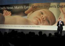 Cameron s-a gândit să puncteze campania cu un poster în care apare un copil cu textul ?Nasul tatei, ochii mamei şi datoria lui Gordon Brown? .