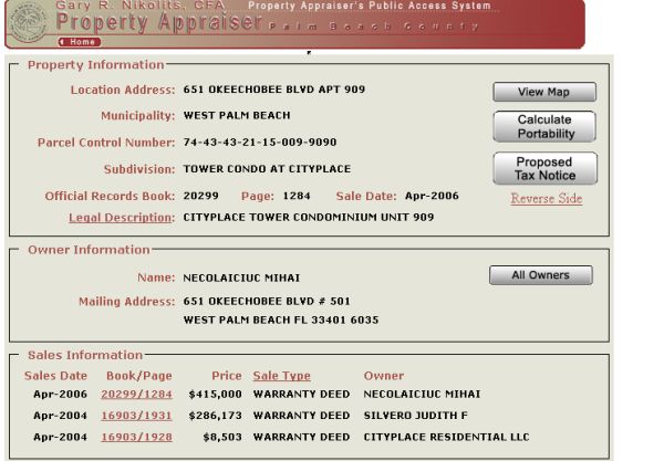 De altfel, la o simplă căutare pe Google, se putea afla demult că Necolaiciuc deţine cel puţin o proprietate în Palm Beach. Iată dovada: