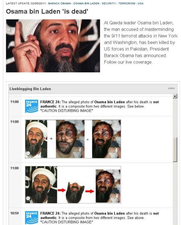 "Este o compoziţie între două imagini diferite. Presupusa fotografie cu Osama Bin Laden după moartea sa nu este autentică", susţine France 24.