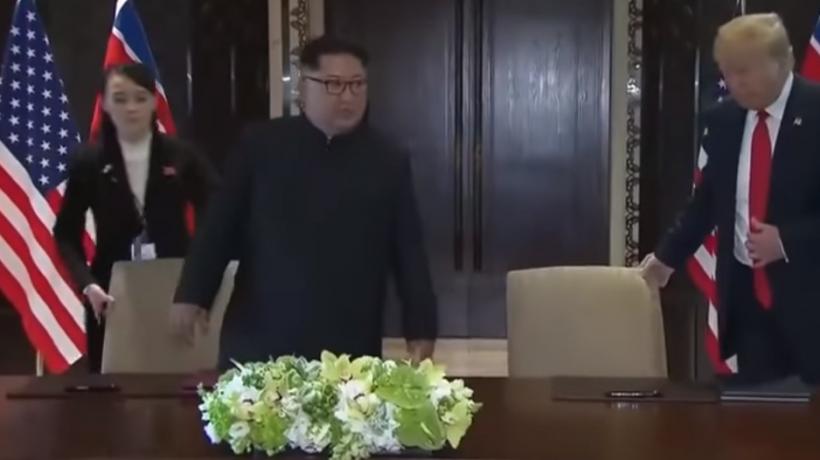 Sora dictatorului care îl însoțește în deaproape în toate deplasările a intervenit în ultimul moment cu mănuși albe și a înlocuit stiloul pus la dispoziție de americani cu unul pe care îl avea ea. Nimeni nu a înțeles pe moment de ce s-a întâmplat asta, chiar în timp ce Kim deja se așezase să semneze.