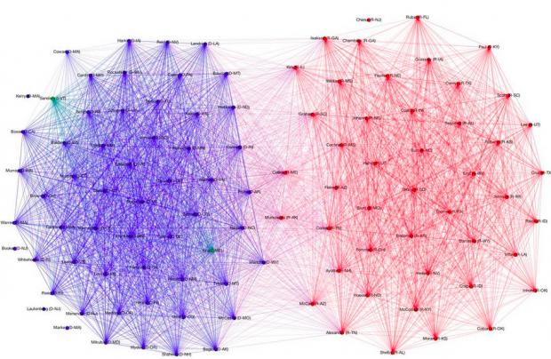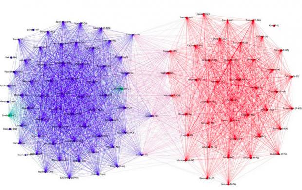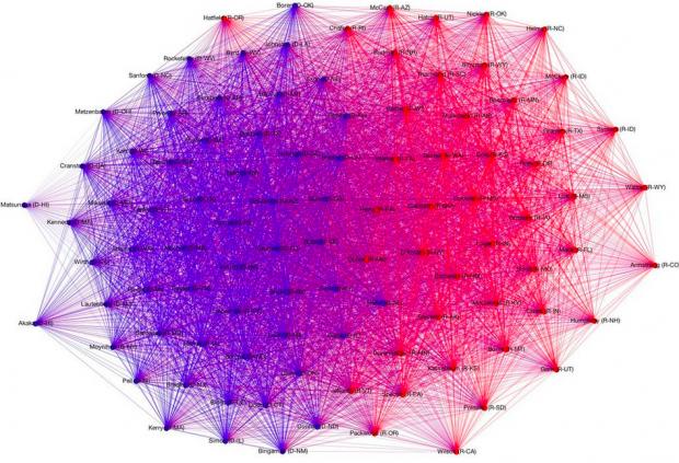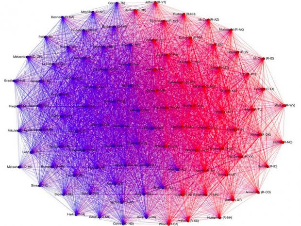 În graficele de mai jos se poate vedea foarte clar care este evoluţia lucrurilor în Senatul american de ma bine de două decenii. Liniile trasate între doi senatori arată faptul că aceştia au votat la fel în peste 100 de situaţii.