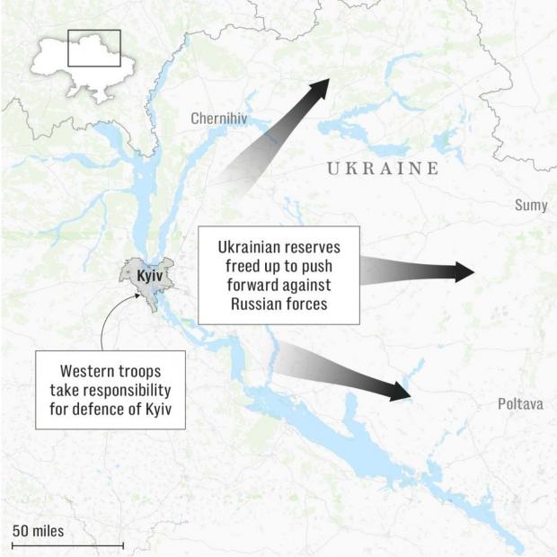 Al doilea scenariu - perimetrul defensiv din jurul Kievului: O coaliție occidentală ar putea forma o graniță defensivă în jurul capitalei Ucrainei, permițând armatei ucrainene să se concentreze pe limitarea forțelor ruse. Cu toate acestea, acest scenariu este văzut ca fiind puțin probabil.