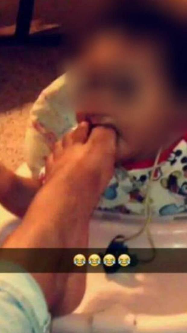 În imagine, se poate observa cum mama îşi bagă degetul mare de la picior în gura copilului ei.