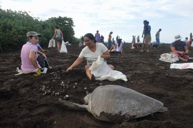 Aceste imagini au fost surprinse pe o plajă din Costa Rica şi au fost denumite de fotografii din întreaga lume ca "Plaja Ruşinii". Aici, pentru câţiva dolari, zeci de localnici adună în saci ouăle broaştelor ţestoase, pe care acestea le depun în nisip.