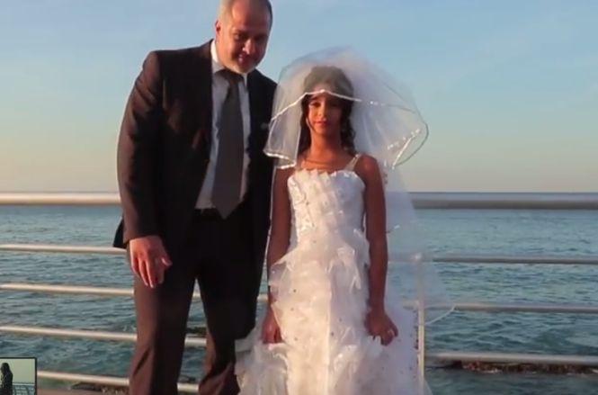 Fetița este machiată, poartă o rochie de mireasă și este ținută strâns de bărbatul care ar putea să-I fie tată sau chiar bunic.