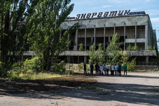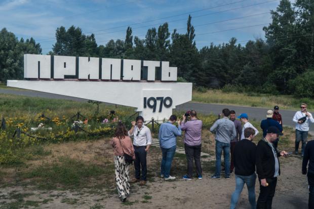 Turiști la intrarea în Pripiat, în 2019. Înainte de război, zona de excluziune de la Cernobîl era una dintre preferatele amatorilor așa-zisului „turism negru”. Foto: Getty Images.