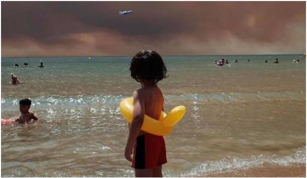 Un băiețel pregătit să înoate se oprește la marginea apei, cu privirea furată de imaginea unui avion folosit la stingerea incendiilor, care zboară la mică altitudine, pe un cer roșu-ruginiu. Pentru mulți, fotografia, care ar fi fost făcută de un turist rus aflat în vacanță în Antalya, a ajuns un simbol al incendiilor violente care au pârjolit litoralul mediteranean al Turciei, în ultimele opt zile.