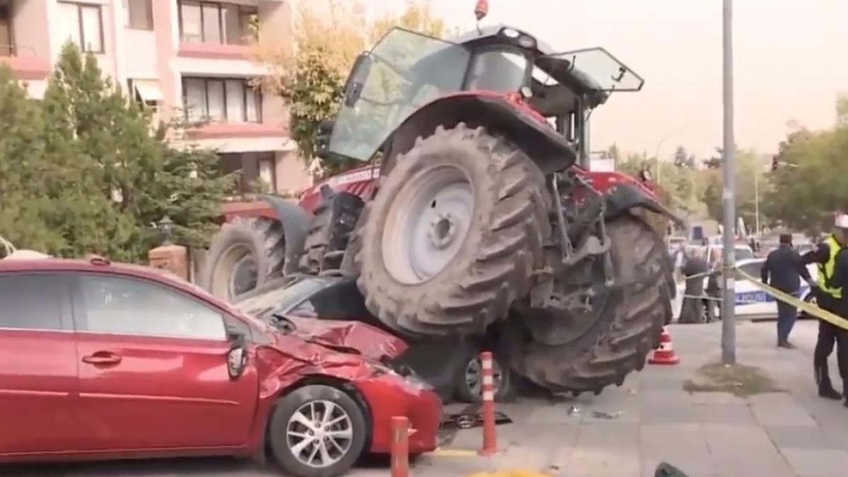 45 year old Turkish man from Beypazari district of #Ankara ignored warning shots by the police and marched forward with his farm tractor, crushing some vehicles on the way. pic.twitter.com/2TuShhDLKr