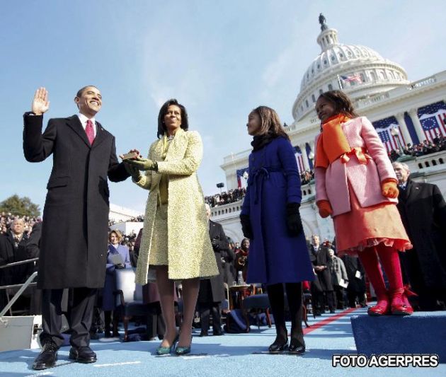 Barack Obama, depune jurământul prin care devine cel de-al 44-lea preşedinte al Statelor Unite ale Americii. Soţia sa, Michelle, ţine biblia lui Abraham Lincoln, în timp ce fiicele lui, Malia, în vârstă de 10 ani, şi Sasha, în vârstă de şapte ani, îl privesc.