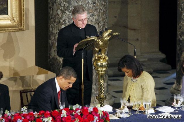 Preşedintele Barack Obama şi Prima Doamnă Michelle Obama îngenunchează la finalul rugăciunii rostite de preotul Casei Reprezentanţilor, Daniel Coughlin, în timpul prânzului de la Statuary Hall din Capitoliu.