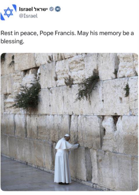 În afară de o declarație a președintelui Herzog, care și-a exprimat condoleanțele lumii catolice și și-a exprimat speranța că „memoria sa va inspira acte de bunătate și speranță pentru umanitate”, premierul Netanyahu și ministrul de Externe, Gideon Sa'ar, au tăcut, fără a face niciun comentariu după moartea Papei.